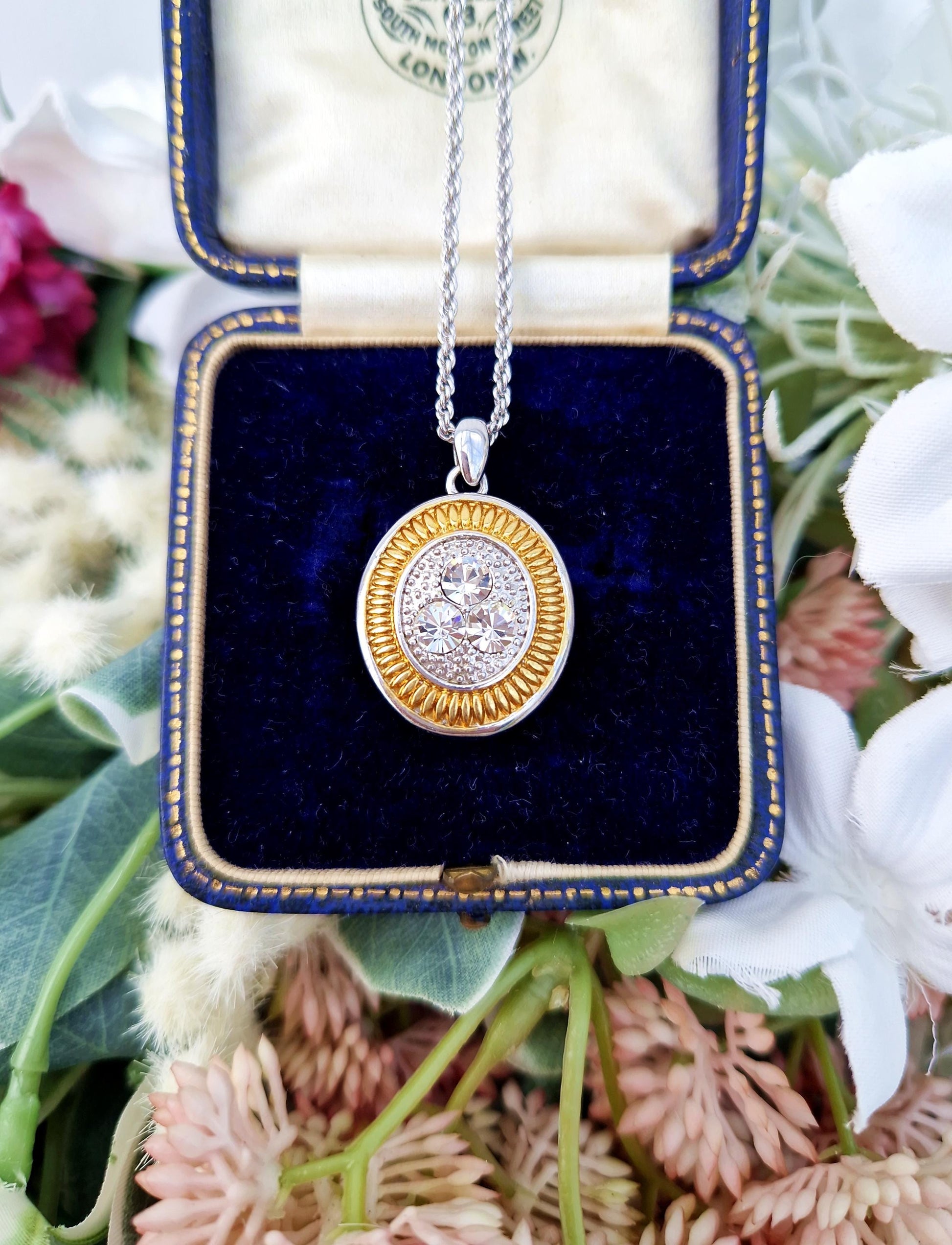 A lovely vintage locket necklace. the locket is oval shaped and has a gold plated accented border, and three sparkly CZ crystal in the middle. A chunky and weighty design, with a lovely substantial rope twisted chain. The locket clips securely shut and could hold a small momento inside.