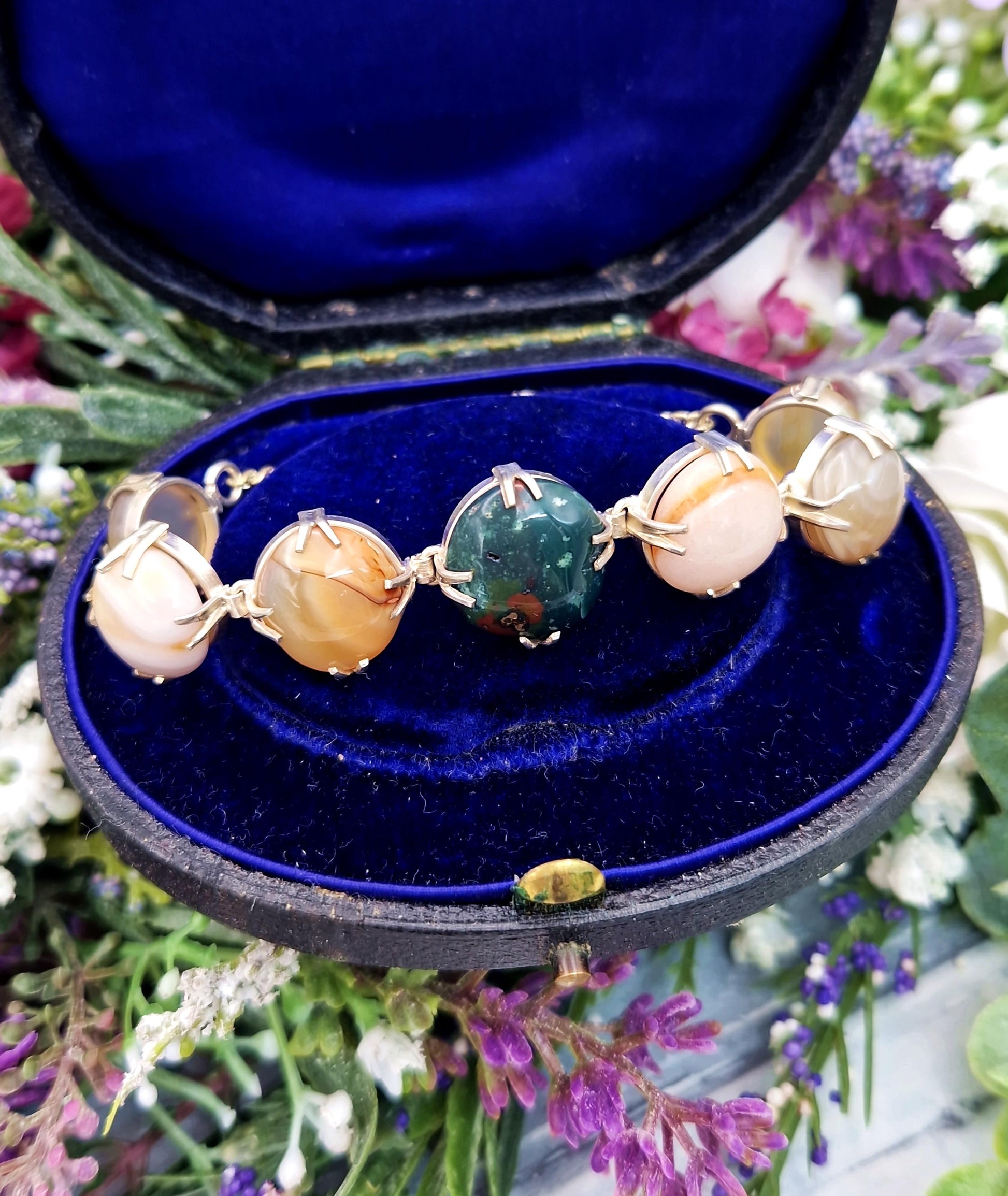 A wonderful vintage silver tone bracelet. The bracelet is claw set with 7 stunning agate cabochons, each has it's own unique colour and personality - with a mixture of moss greens, earthy browns, and sunset oranges. The central agate is the largest, with the stones tapering off and growing gradually smaller on each side. A lovely eye-catching bracelet on the wrist.