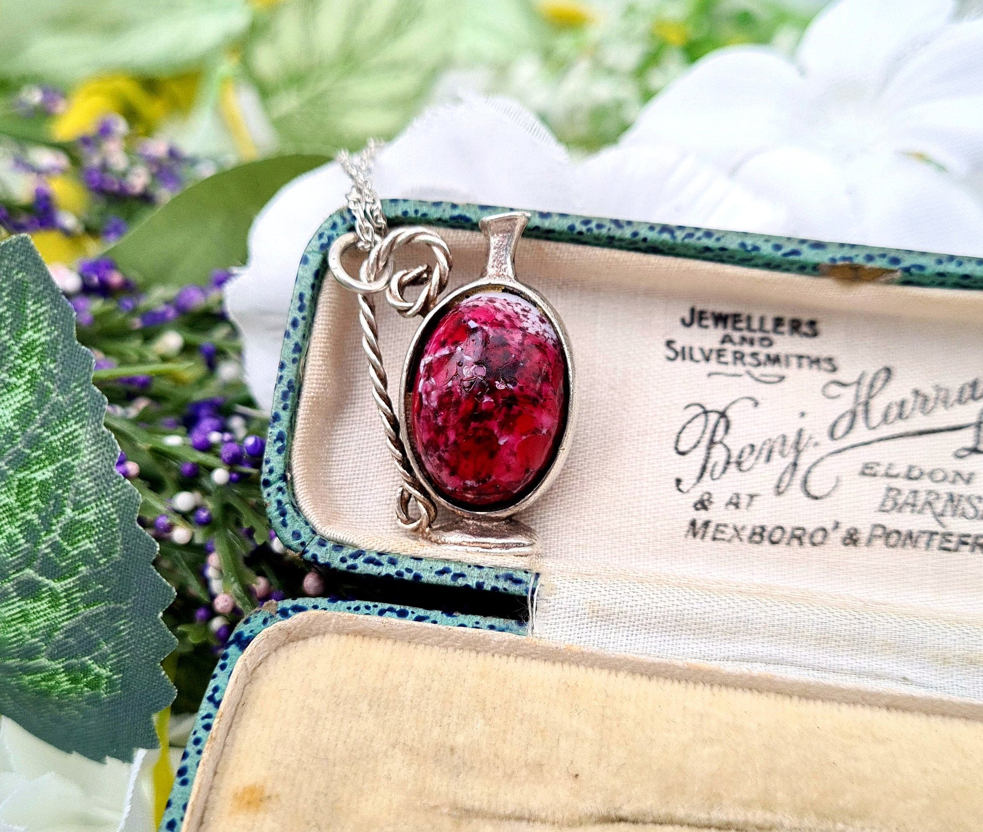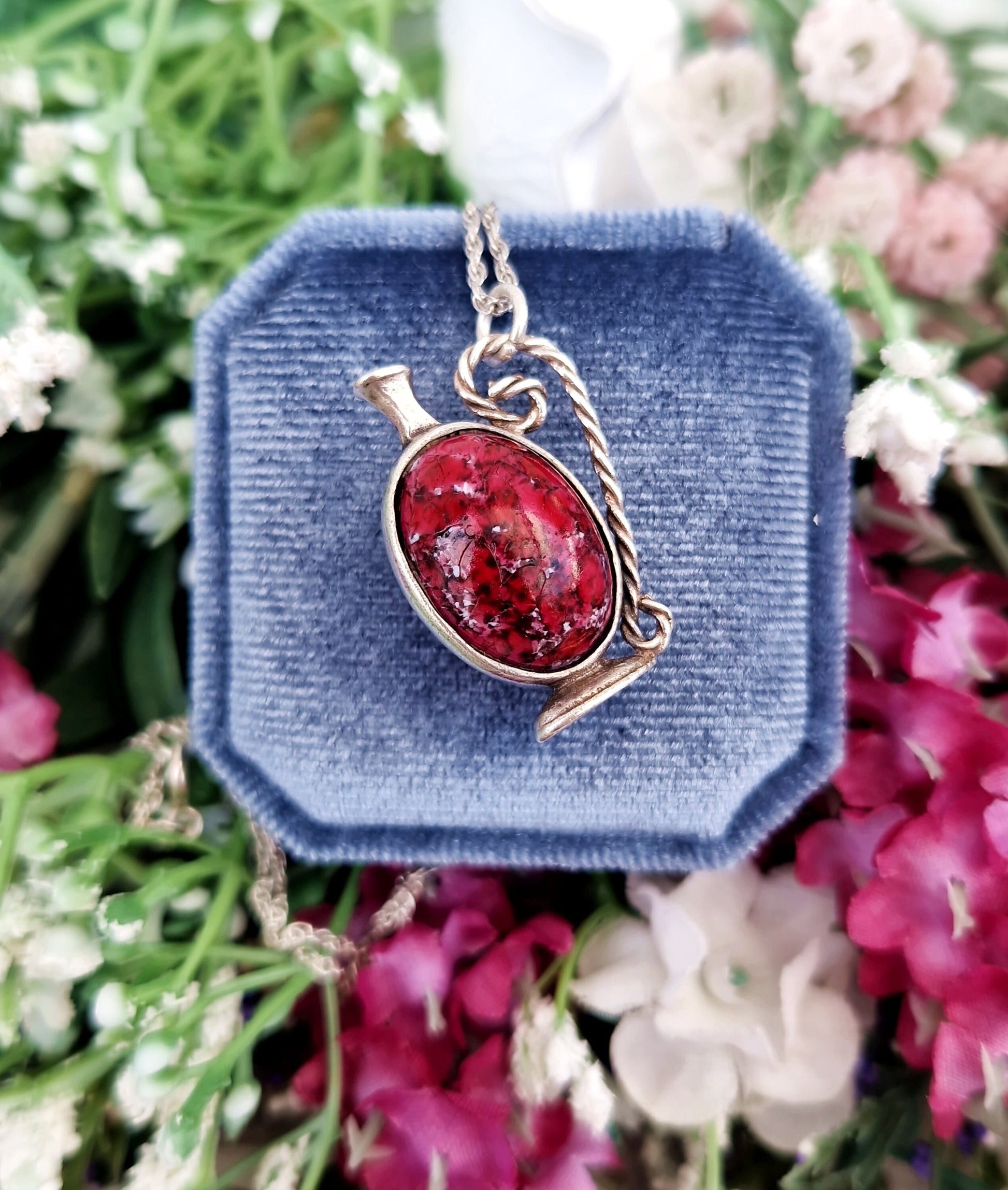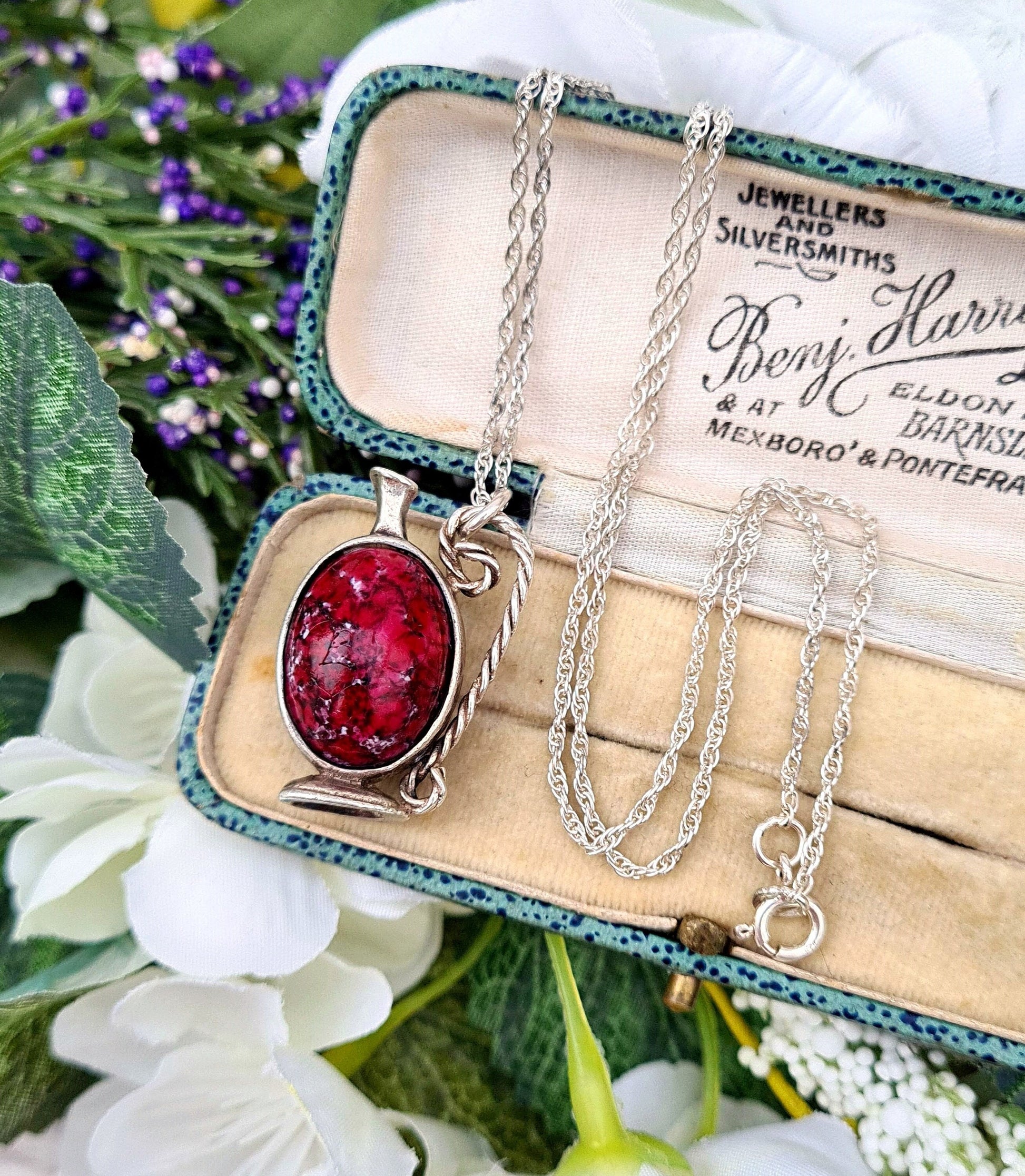 A sterling silver vintage pendant necklace, the pendant is symbolic of the aquarius zodiac sign. A 3D jug / pitcher / ewer. A really striking pendant, as the middle of the jug holds a large oval pink, white and black crackled glass bead. This almost looks like a unique agate on first impression, but we believe it is glass. The handle of the jug is made of twisted solid sterling silver wire, for a very elegant finished look. This unusual pendant has some true age to it, and we predict it was made circa 1930 / 1940.
