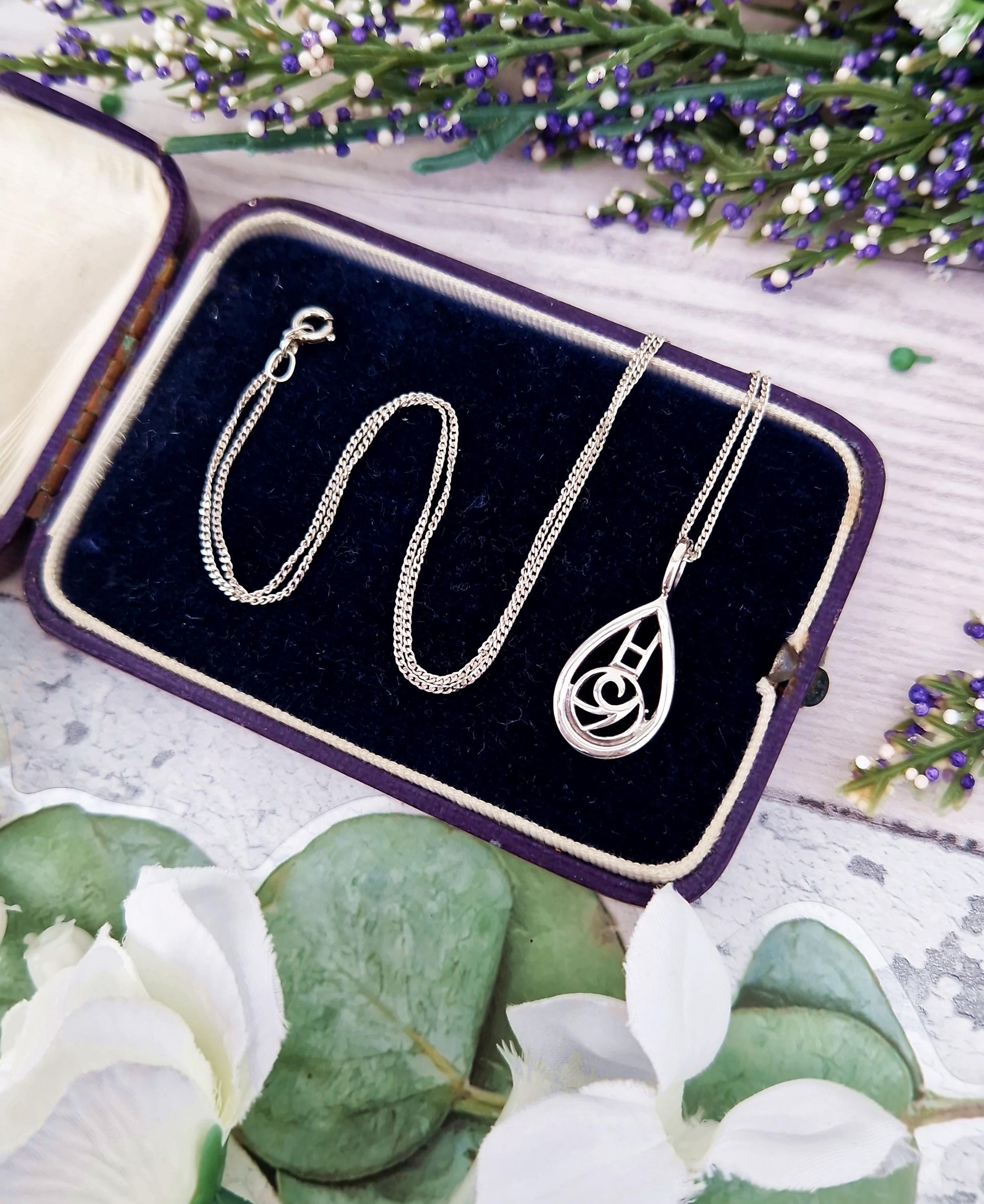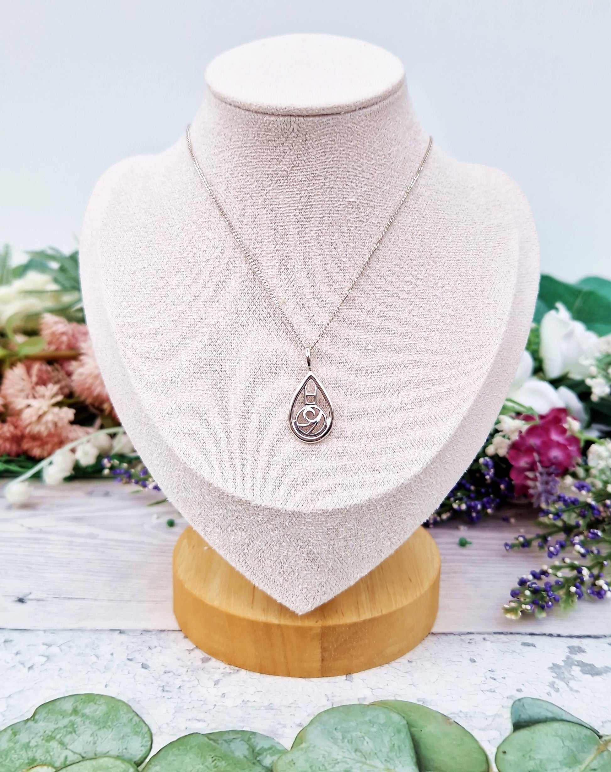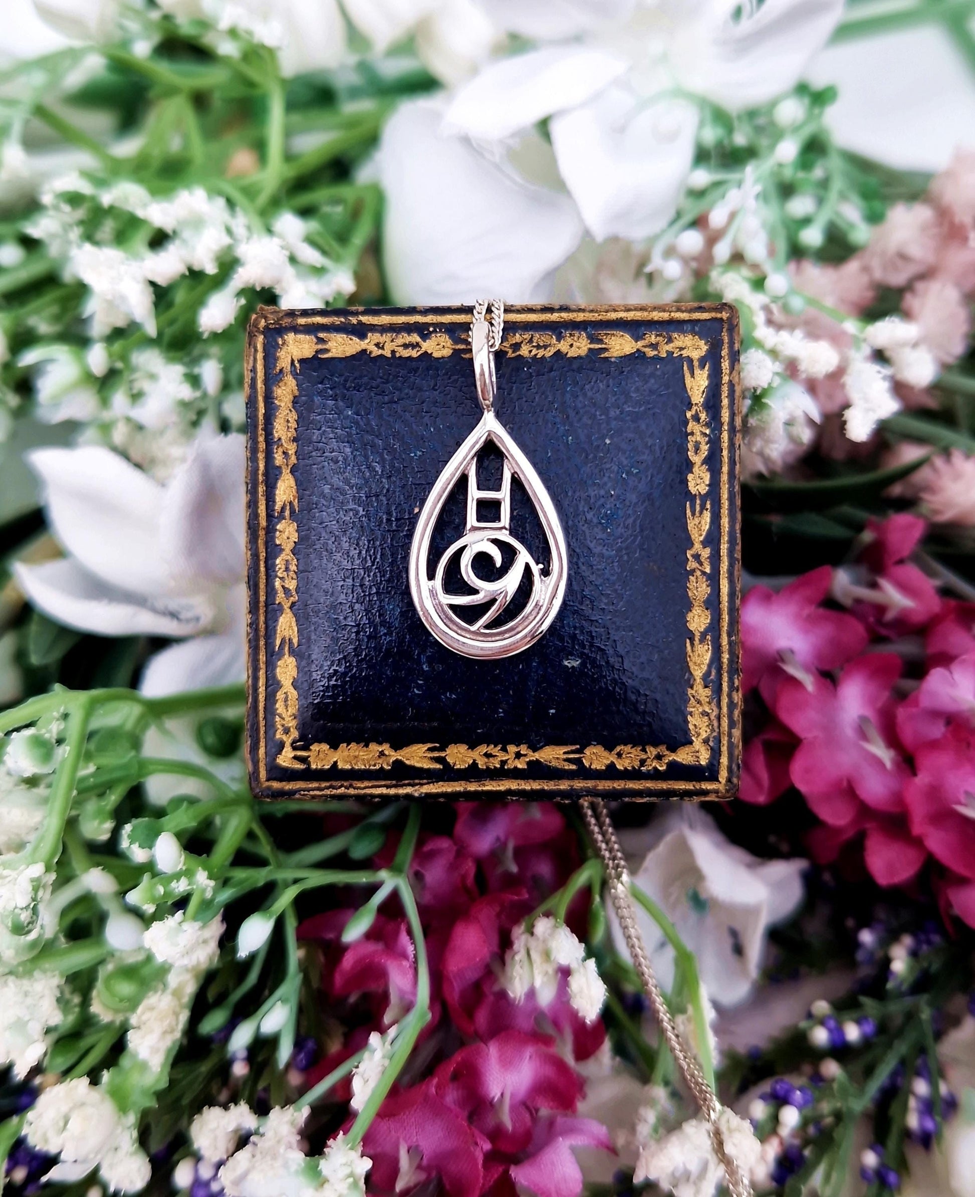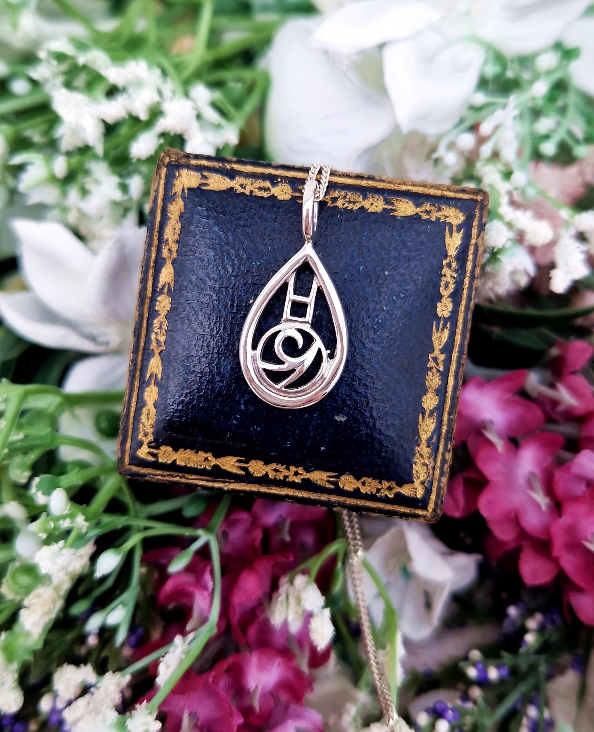 A beautiful Charles Rennie Mackintosh inspired pendant necklace, the lovely pendant depicts a Glasgow Rose design in an elegant teardrop shaped frame. An classic Scottish piece, perfect for daily wear and a gorgeous gift idea.