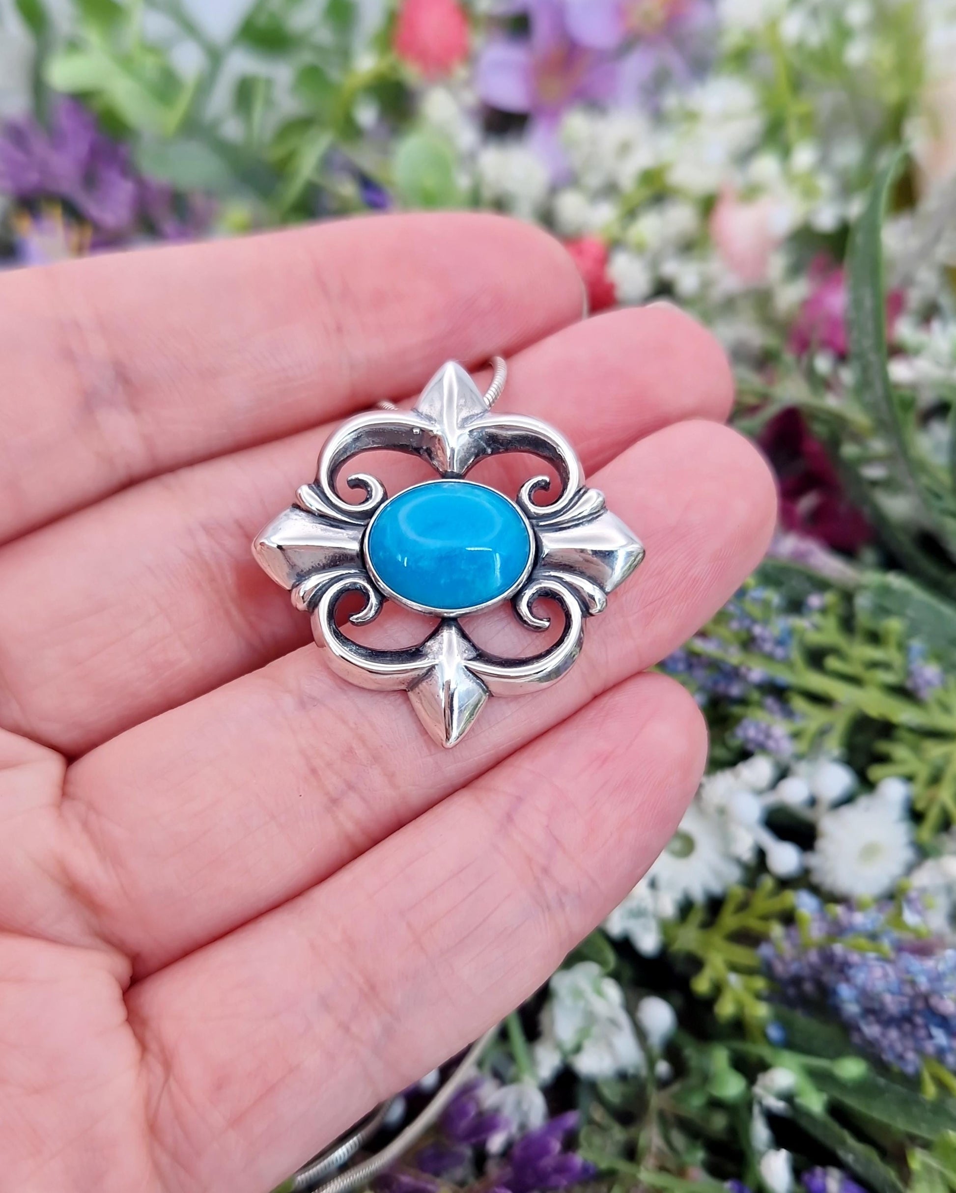 A striking pendant necklace, crafted in solid, heavy sterling silver. This bold and beautiful design showcases an ornate cross-like scrolled frame, which is set with a large bezel mounted blue turquoise cabochon. Our research suggests this piece was possibly designed by renowned American jewellery designer Carolyn Pollack, known for her distinctive Southwestern-inspired creations. Substantial in weight and finely detailed, this pendant feels as meaningful as it is stylish. A statement piece of wearable art.