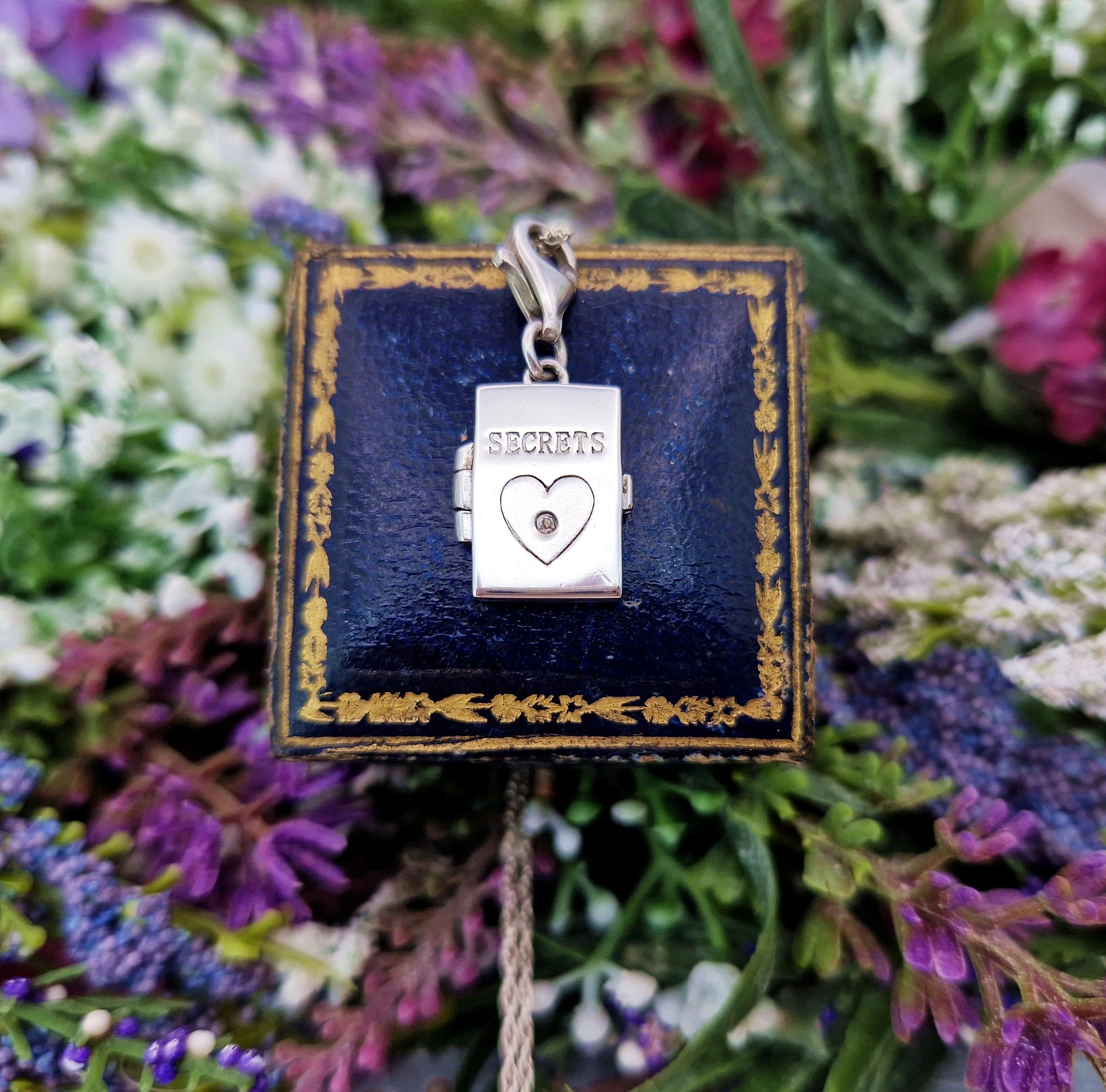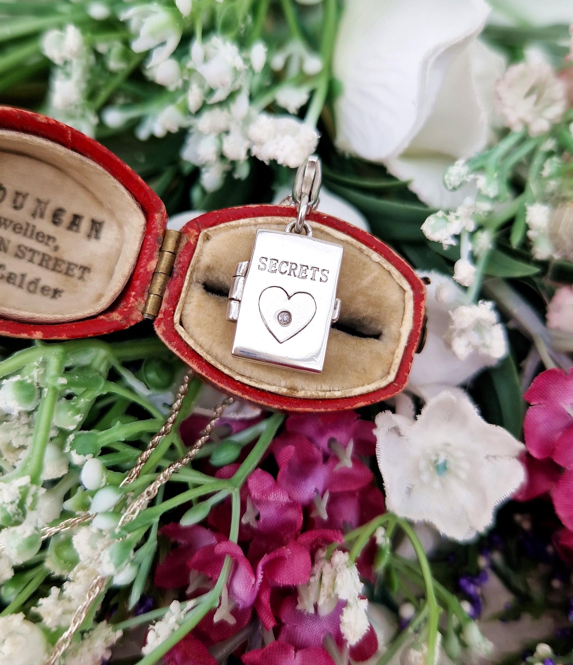 A beautiful small vintage locket, made of solid sterling silver. This locket is shaped like a notebook and has the words 'Secrets' engraved onto the front, it is a small, minimal size that is perfect for daily wear or layering. The front of the locket is also engraved with a love heart, which holds a teeny tiny natural diamond in the center. The locket has a clip fastening, so could be removed from the necklace chain and clipped onto a charm bracelet if preferred.