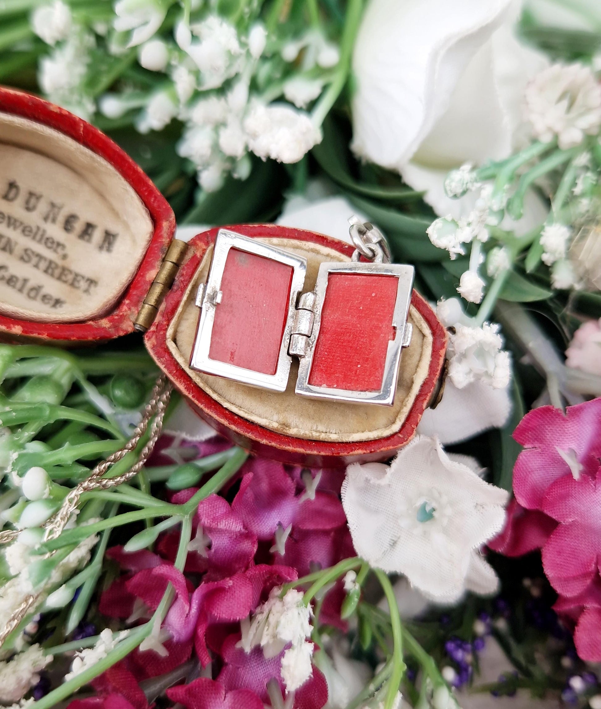 Inside the locket there is space to put two small photos inside, the locket still has the original red backing paper inside. You could put your own tiny photos. Opens and closes securely from the side, closes with a click, to protect the memories you will put inside.
