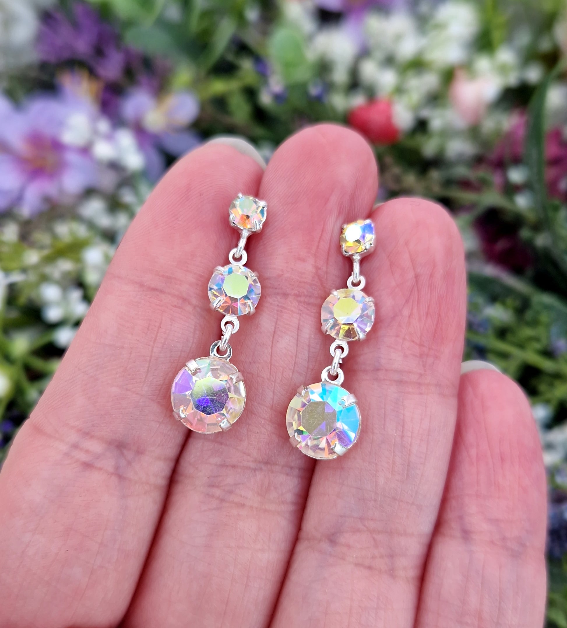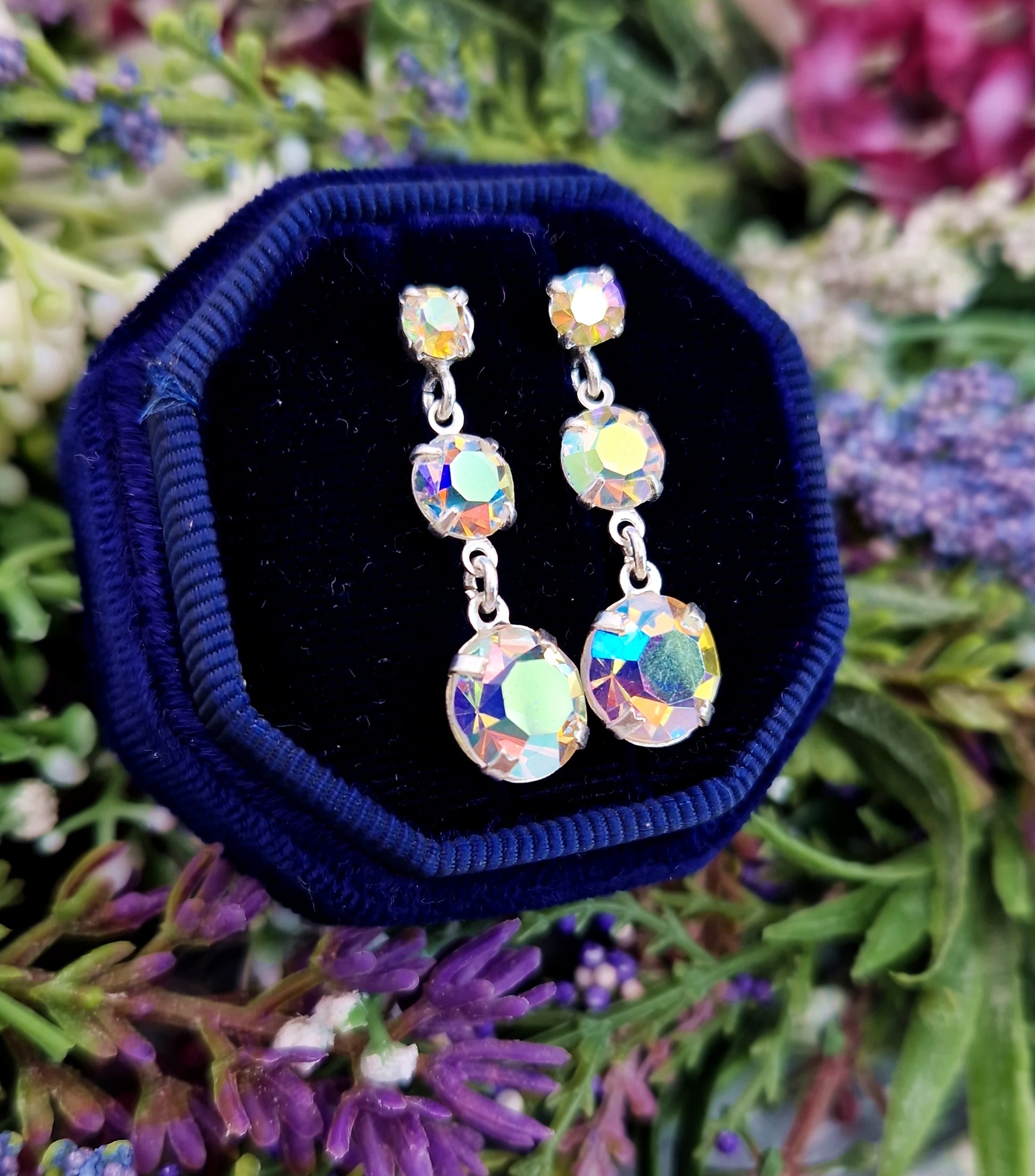 A beautiful pair of vintage sterling silver drop earrings, set with a trilogy of Aurora Borealis glass stones. Each earring features three graduated crystals that catch the light with a rainbow of colours - soft blues, pale golds, lilacs and greens - creating a magical, shimmering effect with every movement.
