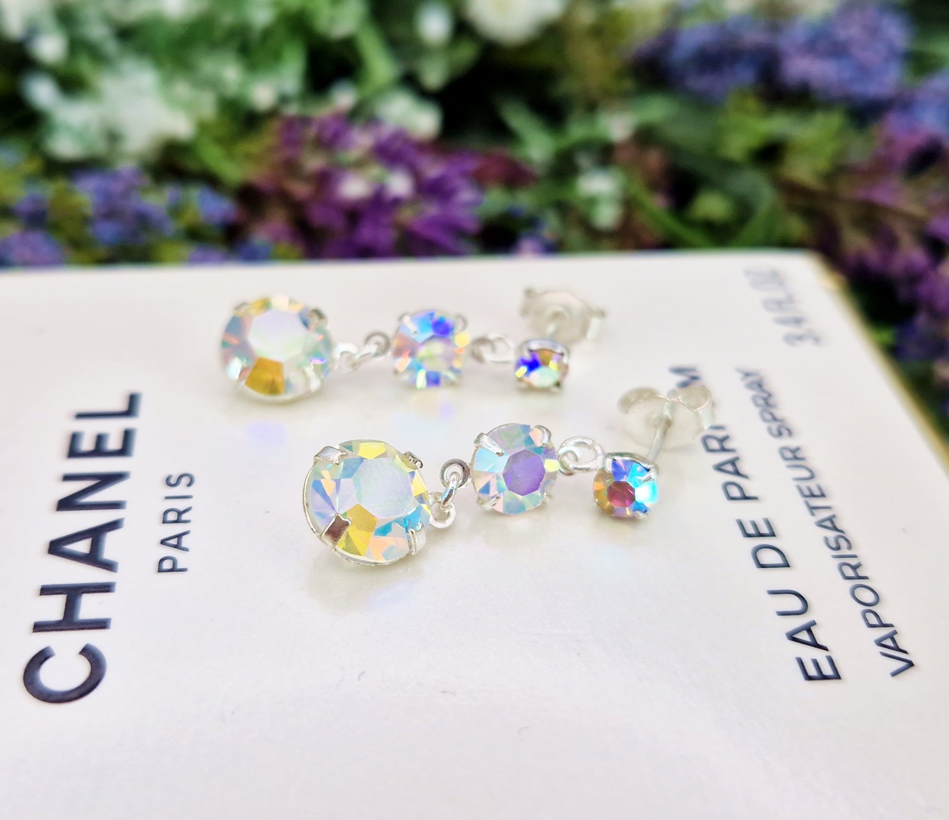The coating on aurora borealis crystals was created to mimic the colours of the Northern Lights, giving ordinary crystal an otherworldly glow. Pieces made with early AB glass have become highly collectible for their distinctive sheen and ethereal beauty. Set in sterling silver and designed with gentle articulation between each stone, these earrings have a lovely dangling movement - elegant, feminine, and full of sparkle. A dazzling pair for special occasions or for adding a little starlight to everyday wear.