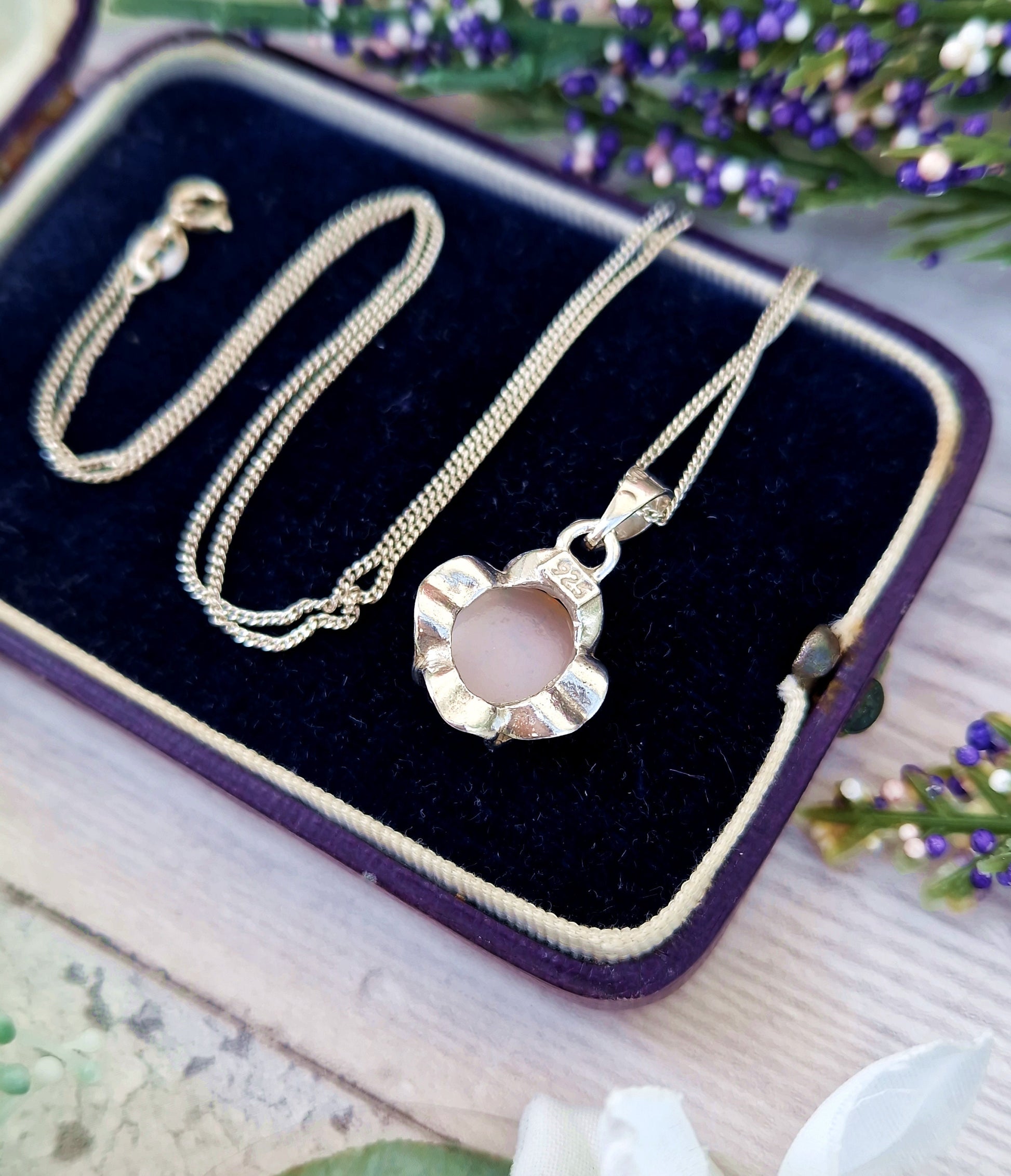Vintage Sterling Silver Irridescent Pink Opal Glass Buttercup Pendant Necklace