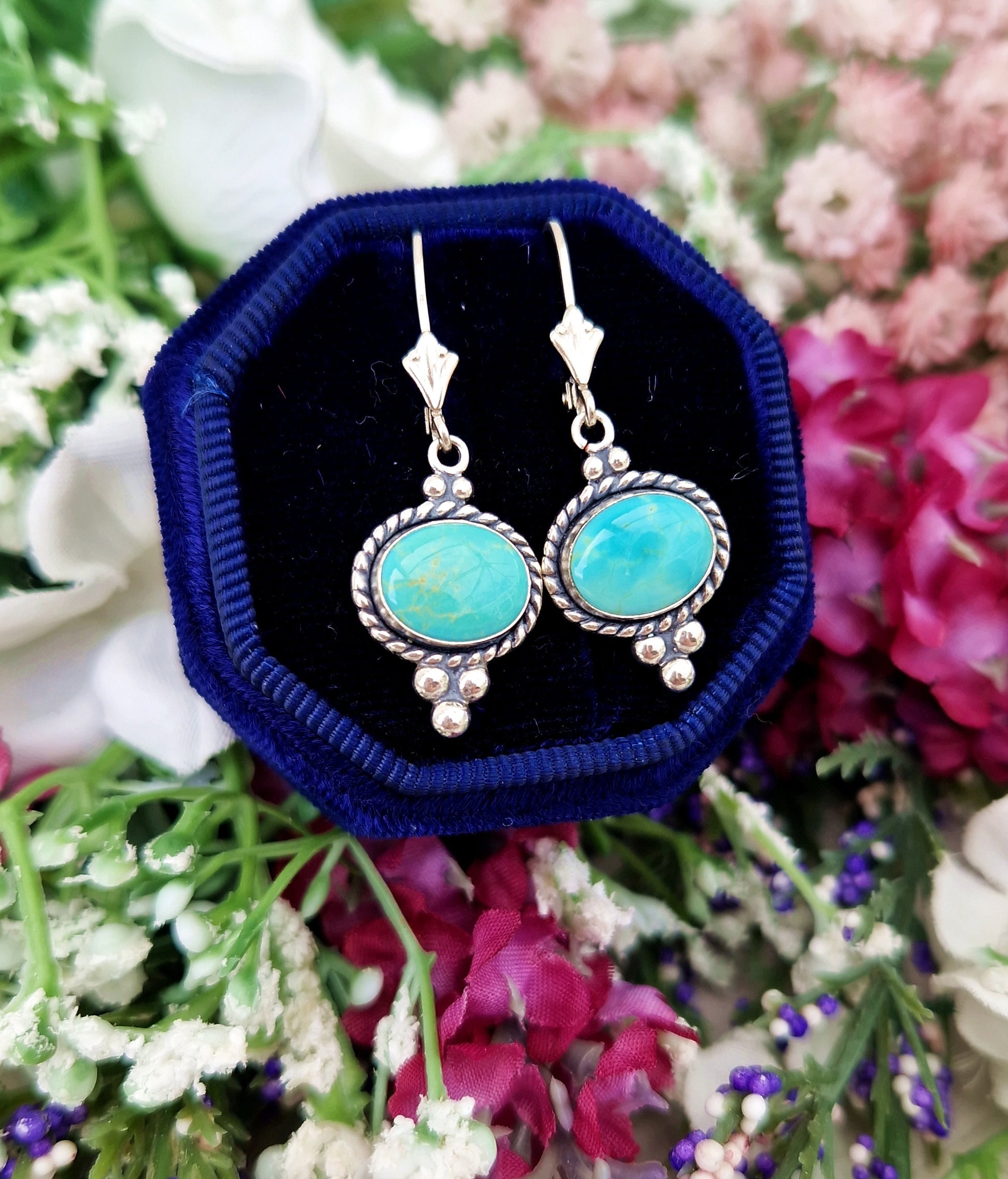 A beautiful pair of sterling silver earrings. Each earrings holds a gorgeous turquoise cabochon within a braided a dn beaded sterling silver frame. With quality lever hook fastenings for pierced ears.