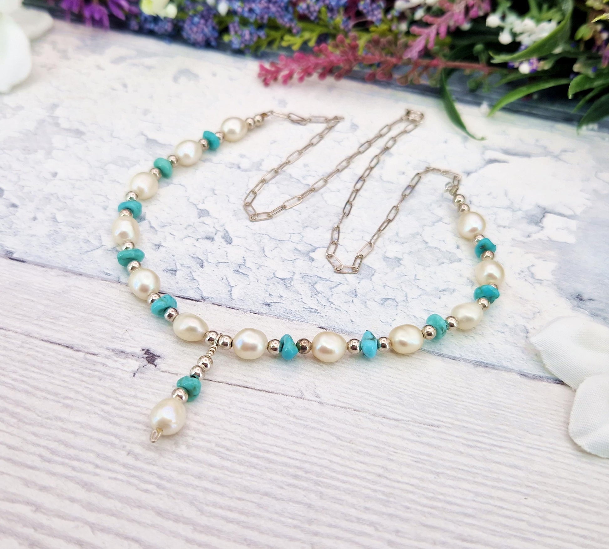 Vintage Sterling Silver White Pearl and Matrix Turquoise Bead Necklace
