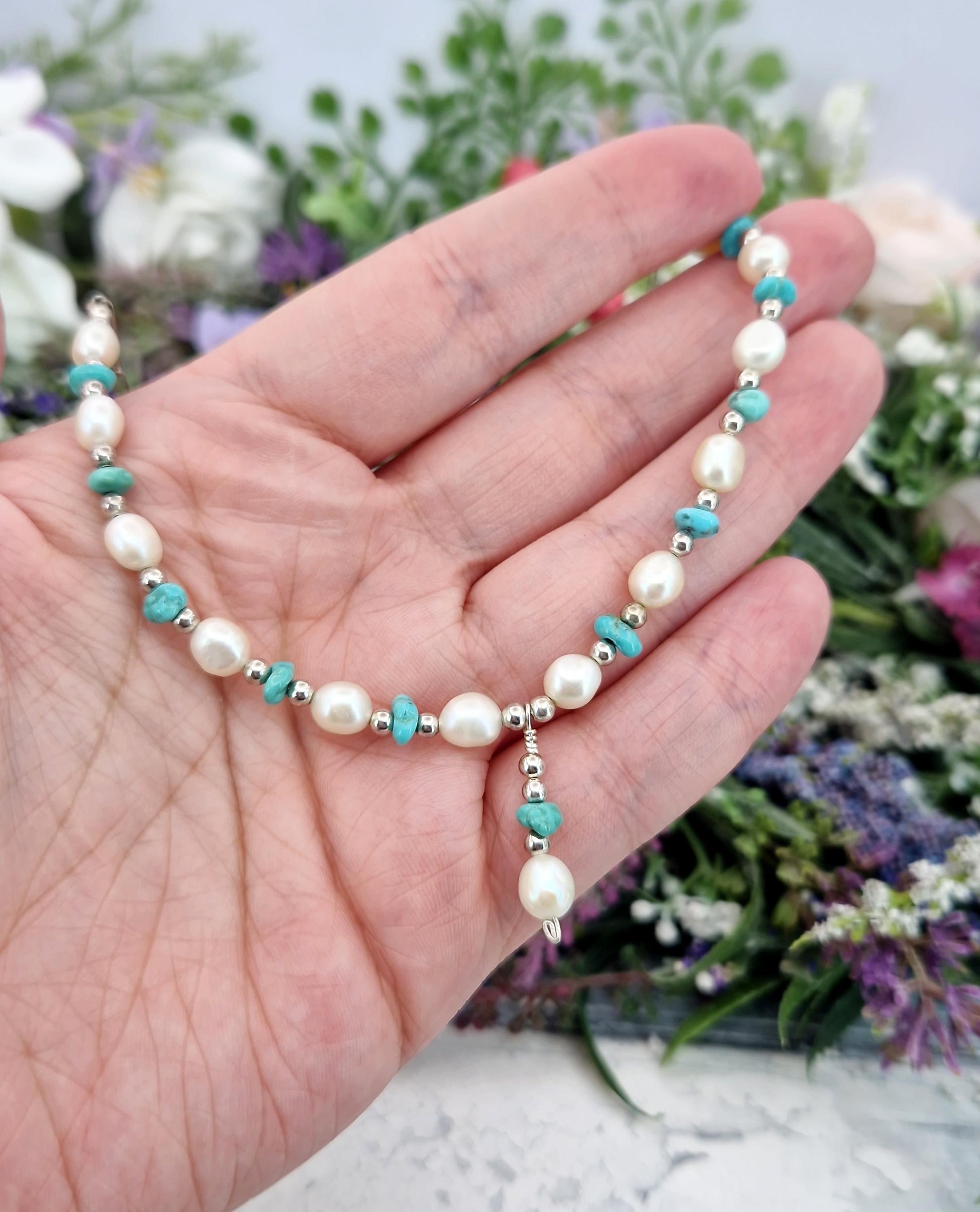 The turquoise pieces are smaller than the pearls and each measures around 3-4 mms in width.